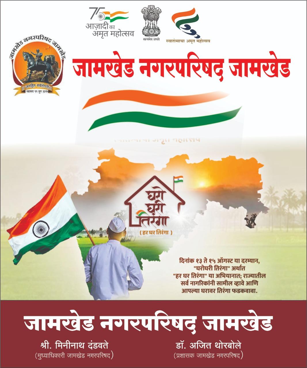 जामखेड शहरात ‘हर घर तिरंगा’ हा उपक्रम यशस्वी करण्यासाठी नगरपरिषदेकडून जनजागृती मोहिम हाती घेण्यात आली आहे. हर घर तिरंगा उपक्रम 13 ऑगस्ट 2022 ते 15 ऑगस्ट 2022 या कालावधीत पार पडणार आहे. या काळात जामखेड नगरपरिषद हद्दीतील प्रत्येक नागरिकांनी आपल्या घरांवर तसेच सर्व शासकीय/ खाजगी आस्थापना/सहकारी संस्था/ शैक्षणिक संस्था यांच्या इमारतीवर राष्ट्रध्वजाची उभारणी स्वयंस्फूर्तीने करावी. सदर ध्वज दिनांक 13 ऑगस्ट 2022 रोजी सकाळी आपापल्या इमारतीवर, घरांवर फडकविण्यात यावा व तो दिनांक 15 ऑगस्ट रोजी 2022 रोजी संध्याकाळी 6.30 वाजता उतरविण्यात यावा असे अवाहन जामखेड नगरपरिषदेेकडून करण्यात आले आहे.