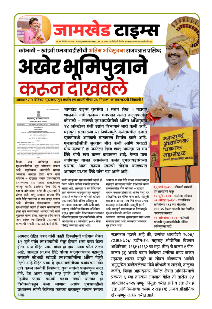 जामखेड टाइम्स वृत्तसेवा । सत्तार शेख । Karjat MIDC NEWS : महाराष्ट्र शासनाने जारी केलेल्या राजपत्रात कर्जत (Karjat) तालुक्यातील कोंभळी – खांडवी एमआयडीसीची (Kombhali Khandavi MIDC) अंतिम अधिसुचना १४ ऑक्टोबर रोजी उद्योग विभागाने जारी केली आहे. महायुती सरकारच्या या निर्णयामुळे कर्जतमधील हजारो युवकांमध्ये आनंदाचे वातावरण निर्माण झाले आहे. ‘एमआयडीसीची सुरुवात मीच केली आणि शेवटही मीच करणार’ हा जनतेला दिला शब्द आमदार प्रा राम शिंदे (Ram Shinde mla) यांनी खरा करून दाखवला आहे. गेल्या पाच वर्षांपासून गाजत असलेल्या कर्जत एमआयडीसीच्या (Karjat MIDC) प्रश्नावर कायम स्वरूपी तोडगा काढण्यात आमदार प्रा.राम शिंदे यांना यश आले आहे.