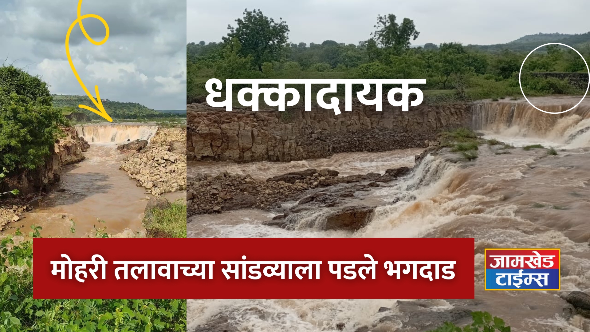 मोहरी परिसरात रविवारी रात्री तुफान पाऊस झाला.मोहरी तलावात प्रचंड वेगाने पाणी आले आहे.आधीच ओव्हर फ्लो असलेल्या या तलावाच्या सांडव्यातून ८ ते १० हजार क्युसेकने पाण्याचा विसर्ग सुरु होता. सांडव्यावरून प्रचंड वेगाने वाहणाऱ्या पाण्याने सांडव्याच्या खडकाळ भरावाच्या अक्षरश: चिंधड्या केल्या. भरावाला सुमारे दीडशे ते दोनशे फुट भगदाड पाडले आहे.यामुळे सर्वत्र खळबळ उडाली आहे.