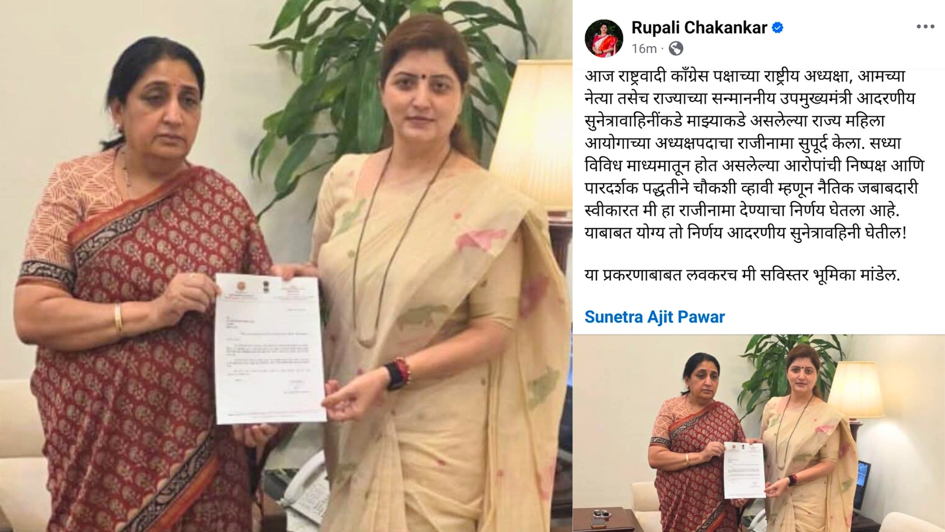 आज राष्ट्रवादी काँग्रेस पक्षाच्या राष्ट्रीय अध्यक्षा, आमच्या नेत्या तसेच राज्याच्या सन्माननीय उपमुख्यमंत्री आदरणीय सुनेत्रावाहिनींकडे माझ्याकडे असलेल्या राज्य महिला आयोगाच्या अध्यक्षपदाचा राजीनामा सुपूर्द केला. सध्या विविध माध्यमातून होत असलेल्या आरोपांची निष्पक्ष आणि पारदर्शक पद्धतीने चौकशी व्हावी म्हणून नैतिक जबाबदारी स्वीकारत मी हा राजीनामा देण्याचा निर्णय घेतला आहे. याबाबत योग्य तो निर्णय आदरणीय सुनेत्रावहिनी घेतील! या प्रकरणाबाबत लवकरच मी सविस्तर भूमिका मांडेल, अशी फेसबुक पोस्ट लिहीत रूपाली चाकणकर यांनी आपल्या राजीनाम्याची घोषणा केली.