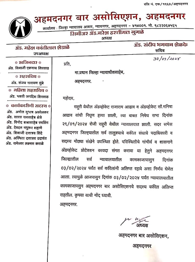 परिस्थितीचे गांभीर्य व शासनाने अॅडव्होकेट प्रोटेक्शन कायदा संमत करावा या हेतुने अहमदनगर जिल्ह्यातील सर्व न्यायालयातील कामकाजापासुन दिनांक ०३/०२/२०२४ पर्यंत सर्व वकीलांनी अलिप्त रहावे असा निर्णय घेणेत आला. त्यामुळे आजपासुन दिनांक ०३/०२/२०२४ पर्यंत न्यायालयातील कामकाजापसुन अहमदनगर बार असोसिएशनचे सदस्य वकील अलिप्त राहतील, असे म्हटले आहे.