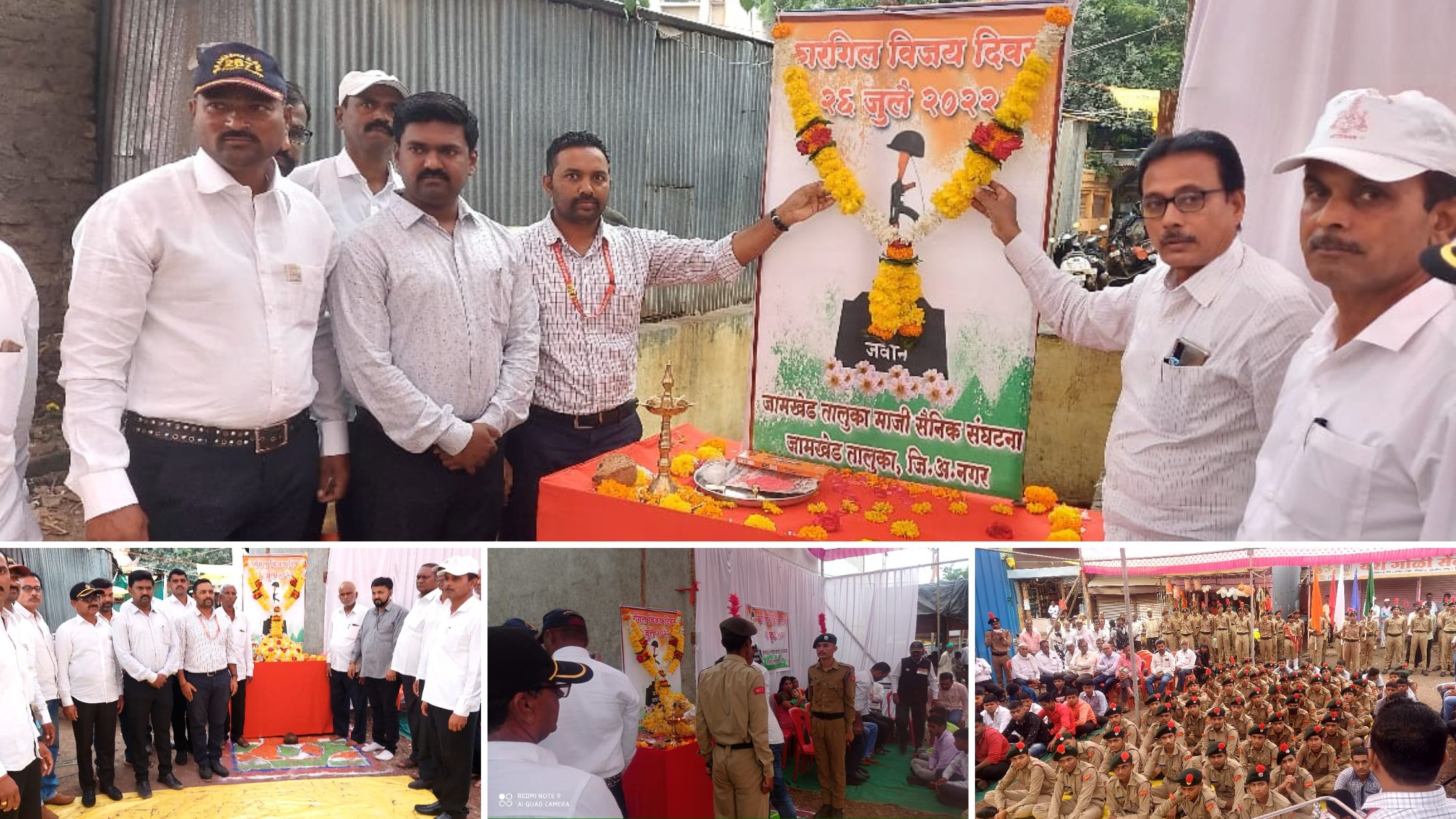 आज जामखेड शहरात जामखेड तालुका माजी सैनिक संघटना आजी-माजी सैनिक व 17 महाराष्ट्र बटालियन एनसीसी अ.नगर, जामखेड तहसील कार्यालय, जामखेेड पोलीस विभाग, जामखेड नगरपरिषद ,कृषी विभाग आणि ग्रामस्थ यांच्या वतीने जामखेड शहरातील शहीद सैनिक स्मारक या ठिकाणी कारगिल विजय दिवस साजरा करत शहीद जवानांना मानवंदना देण्यात आली.