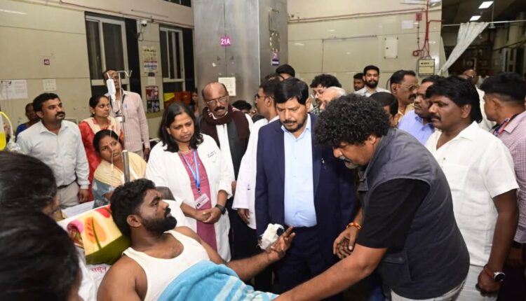 आरपीआयचे जिल्हाध्यक्ष सुनिल साळवे यांच्या कुटुंबातील सदस्यांवर एका टोळक्याने रविवार दि, २४ ऑगस्टच्या रात्री जामखेड तालुक्यातील नान्नज येथे सशस्त्र हल्ला केला होता. या हल्ल्यात ७ जण जखमी झाले होते.यातील गंभीर जखमींवर पुण्यातील ससुन रूग्णालयात उपचार सुरु आहेत. या जखमींची विचारपूस करण्यासाठी केंद्रीय मंत्री रामदास आठवले यांनी गुरुवारी रात्री ससुन रूग्णालयास भेट दिली. यावेळी त्यांनी जखमींची विचारपूस केली.