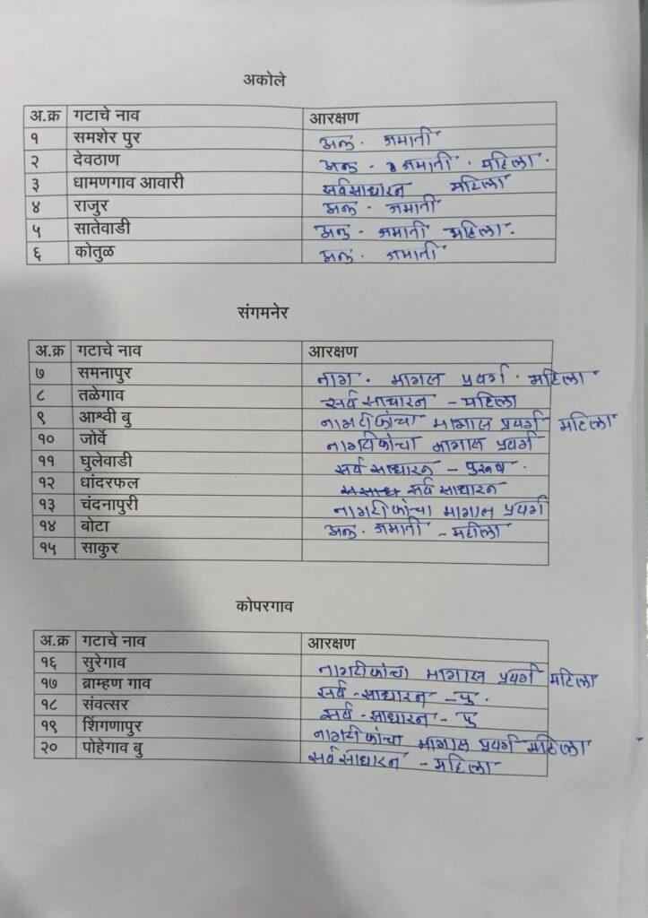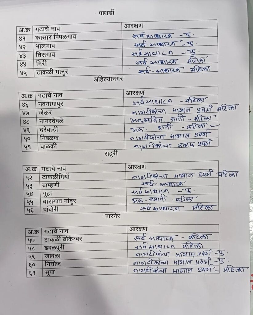 अहमदनगर जिल्हा परिषदेच्या ७५ गटांचे आरक्षण खालील प्रमाणे
