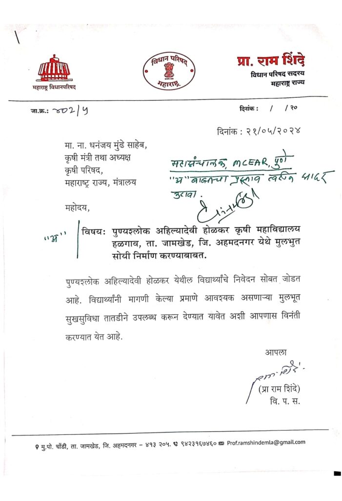 आमदार प्रा.राम शिंदे यांनी दिलेल्या निवेदनाची कृषिमंत्री धनंजय मुंडे यांनी तातडीने दखल घेतली. महासंचालक MCEAR पुणे यांनी ‘अ’ बाबतचा प्रस्ताव तातडीने सादर करावा असे आदेश कृषिमंत्र्यांनी दिले आहेत. वर्षभरापासून अनेक गैरसोयींचा सामना करत असलेल्या हळगाव कृषि महाविद्यालयातील विद्यार्थ्यांचा प्रश्न आमदार प्रा.राम शिंदे यांनी शासन दरबारी तातडीने पोहचवला. या प्रश्नावर तोडगा काढण्यासाठी शासनस्तरावरून तातडीने हालचाली सुरू झाल्या आहेत. आमदार प्रा राम शिंदे यांच्या माध्यमांतून हळगाव कृषि महाविद्यालयातील विद्यार्थ्यांच्या समस्या लवकरच सुटणार आहेत. यामुळे विद्यार्थ्यांमध्ये समाधानाचे वातावरण आहे.
